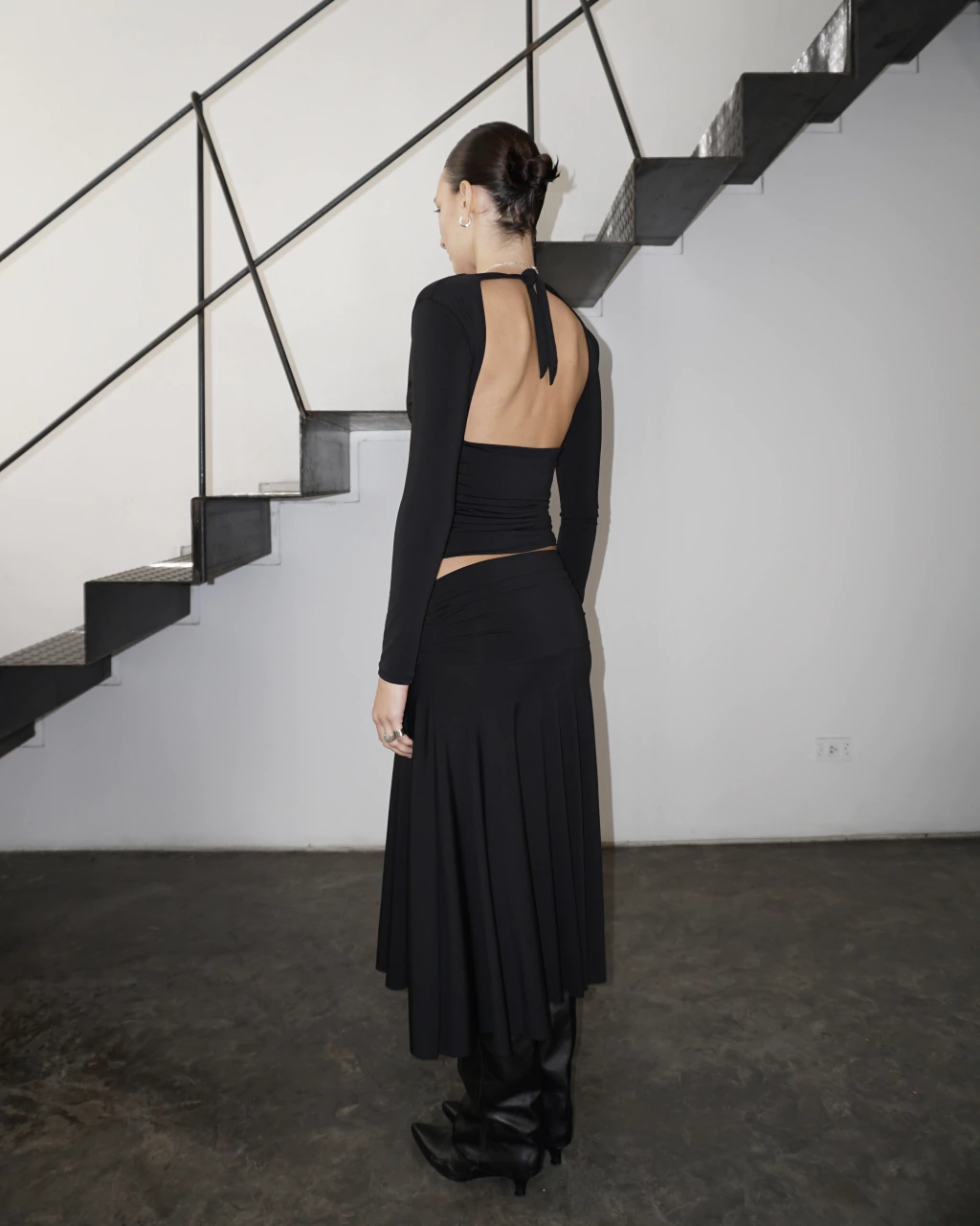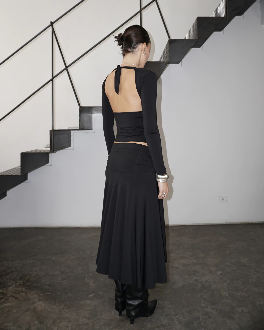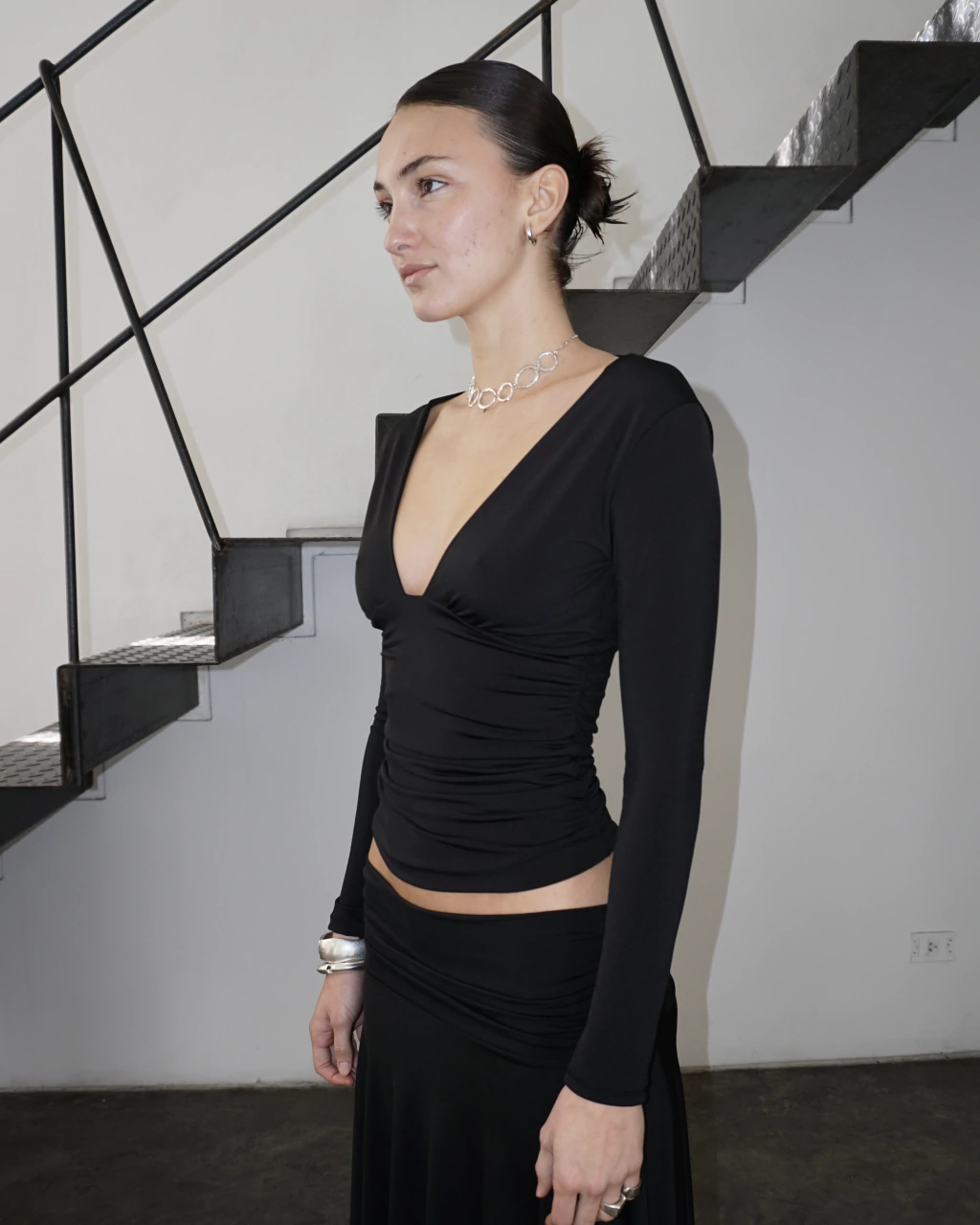 Top con frunces en costados, escotado, mangas largas, y espalda descubierta para atar al cuello.