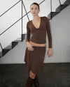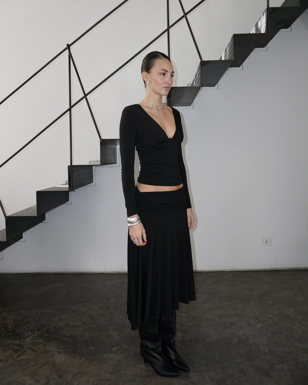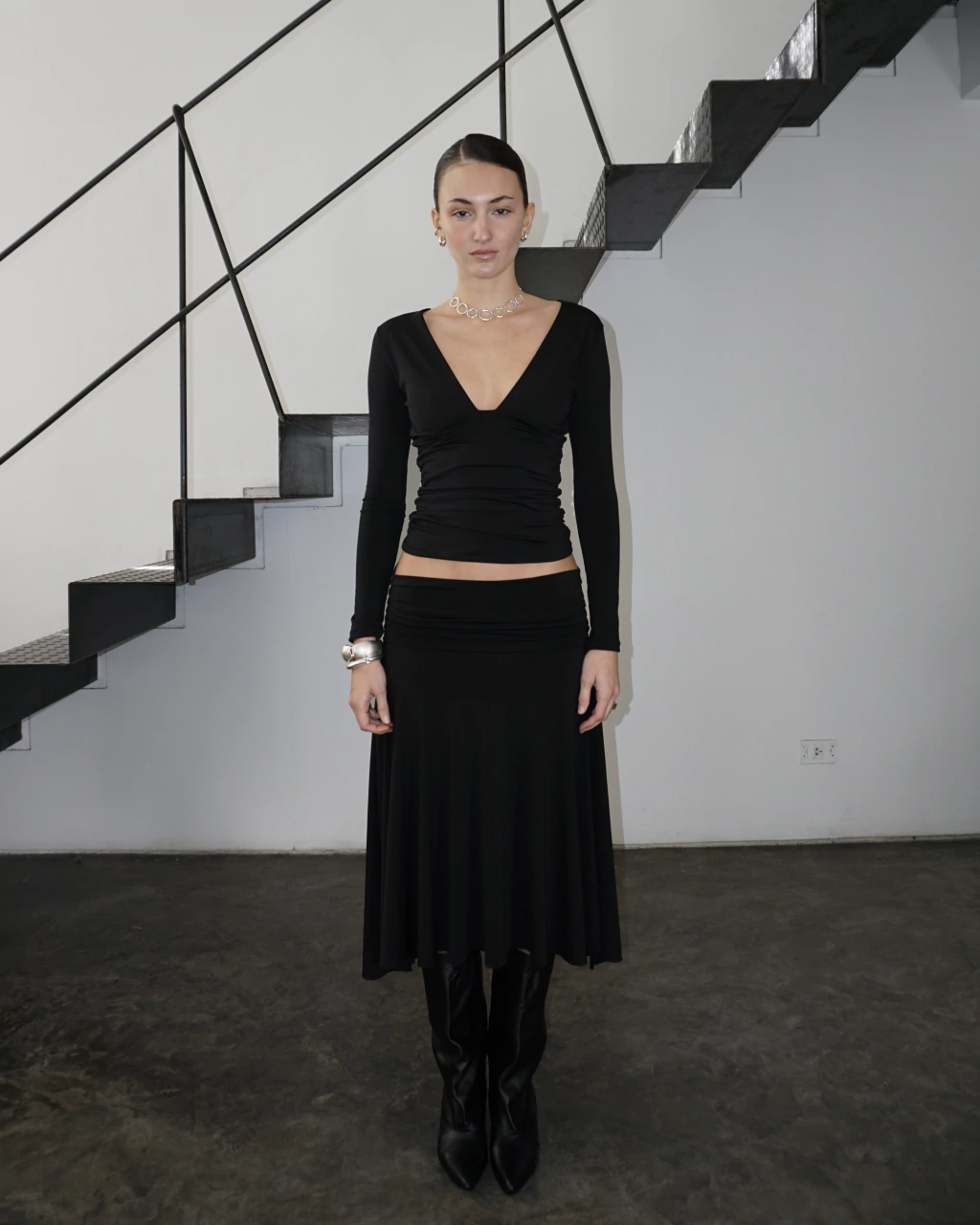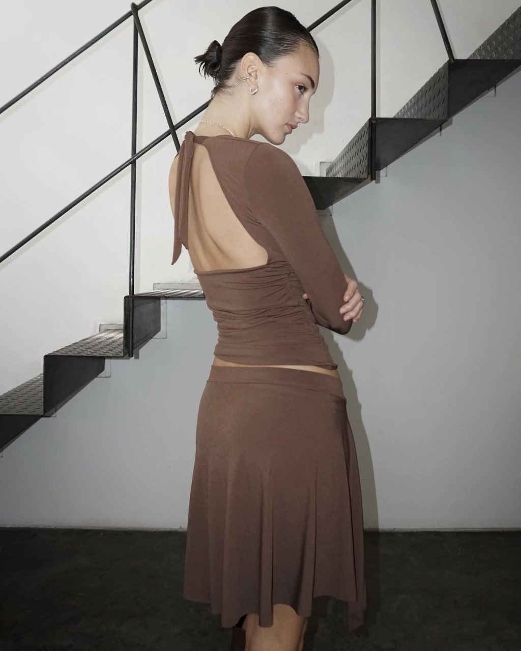 Top con frunces en costados, escotado, mangas largas, y espalda descubierta para atar al cuello.
