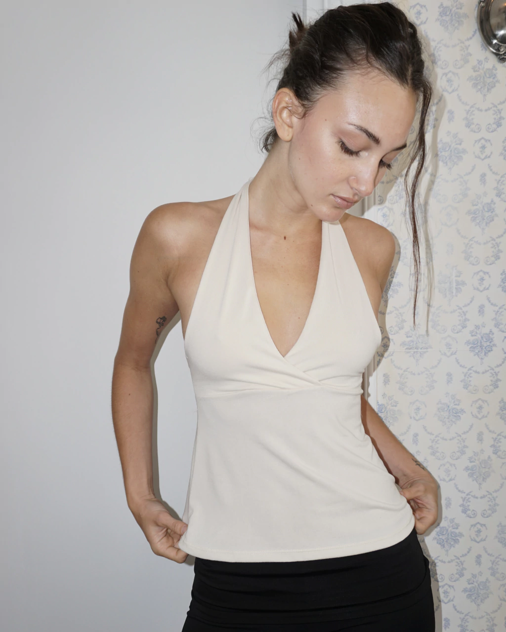 Top con escote y doble delantero que se ata al cuello. Corte amplio en cintura.