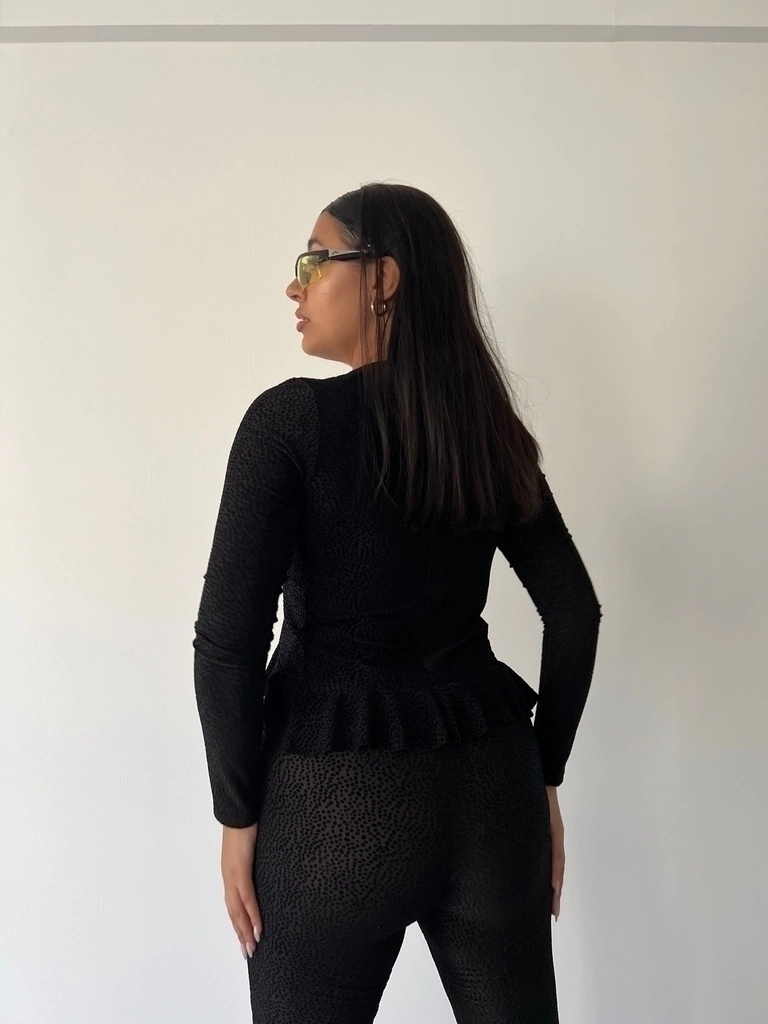 único por su tela. Con sutil transparencia. Dibujo en tela de manchitas aterciopeladas.