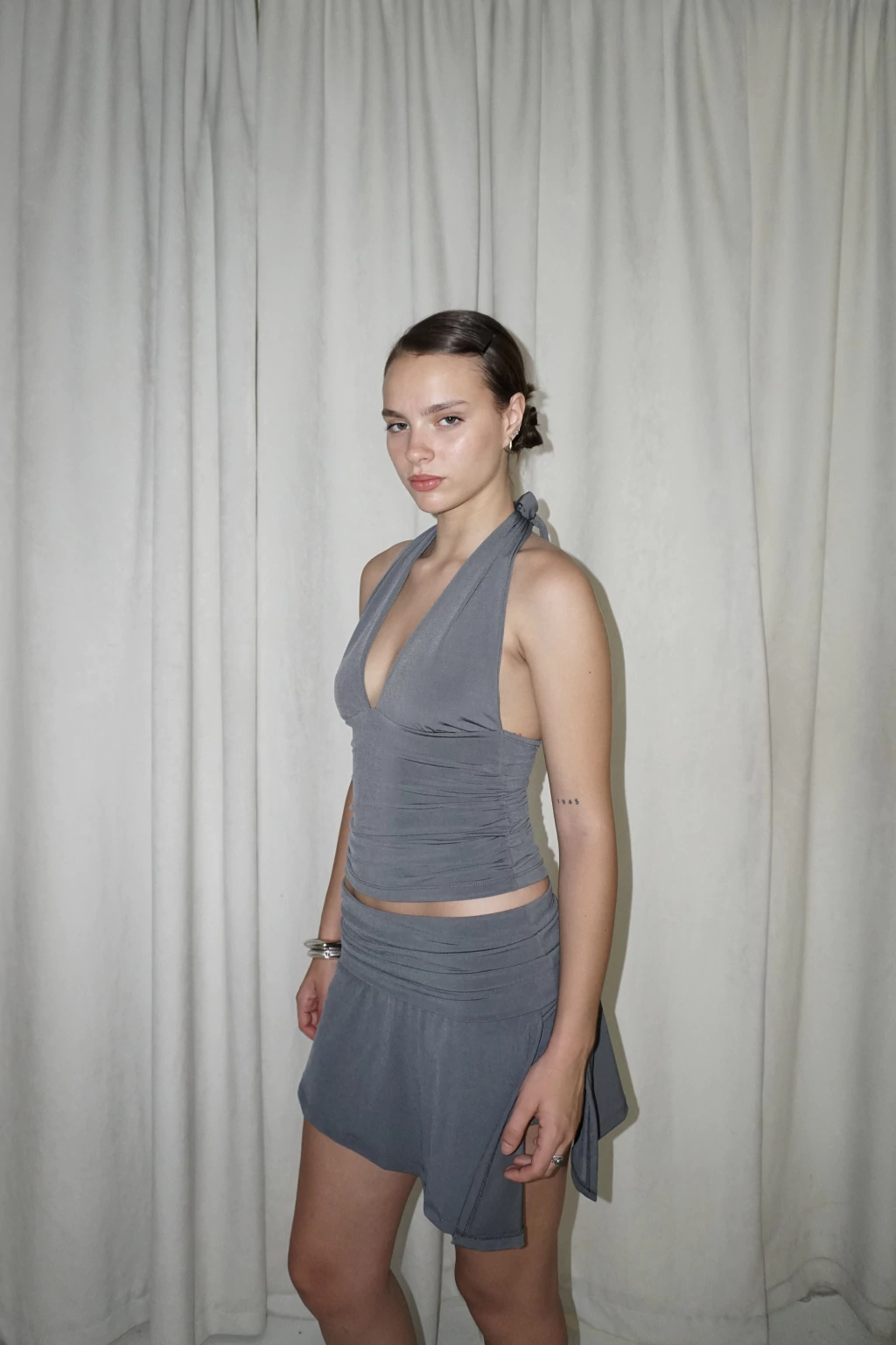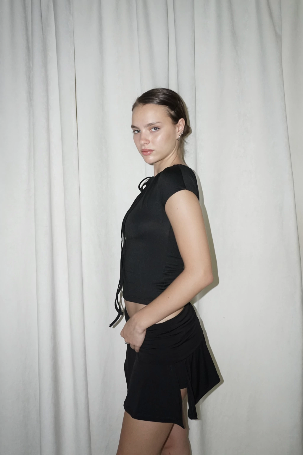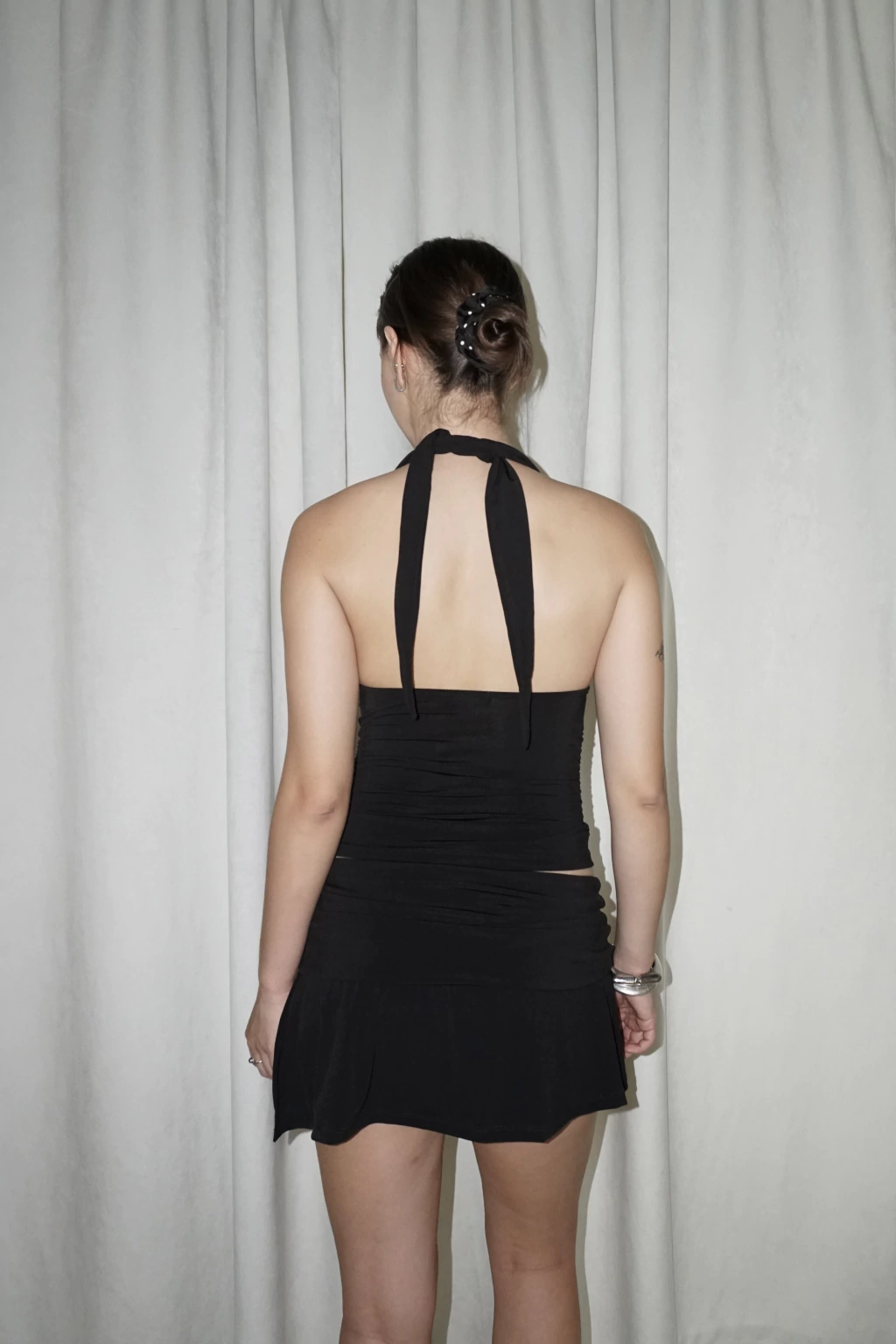 Mini con corte en diagonal, cintura embolsada y short debajo.